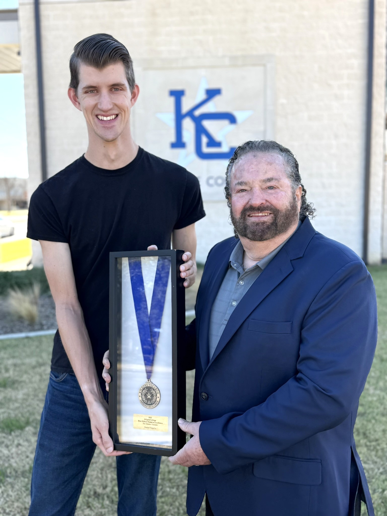 Kilgore College Foundation Board Member Gene Keenon (right) visits with Trevor Newlin Jan. 2 after awarding the KC alum his Blue Ribbon Medal of Excellence for Student Success.”
