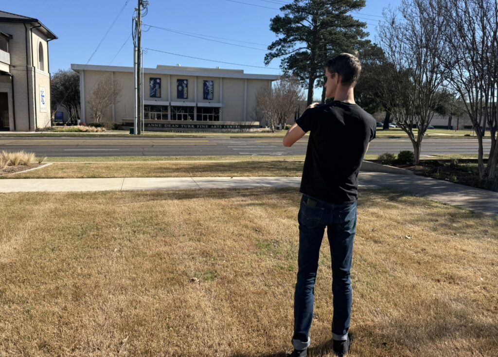 Kilgore College Theatre alum Trevor Newlin (“Alien: Romulus,” “Superman,” “Smile 2” and the Amazon Yeti, among other credits) snaps a picture of his old stomping grounds, the Anne Dean Turk Fine Arts Center, Friday.