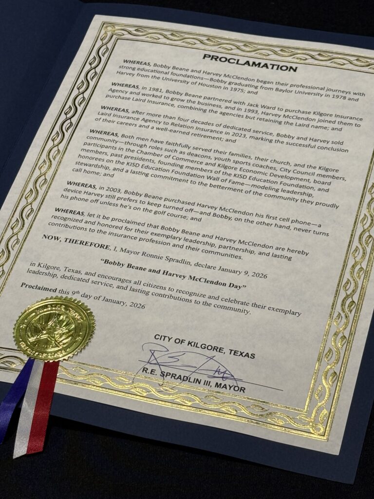 WHEREAS, in 1981, Bobby Beane partnered with Jack Ward to purchase Kilgore Insurance Agency and worked to grow the business, and in 1993, Harvey McClendon joined them to purchase Laird Insurance, combining the agencies but retaining the Laird name; and